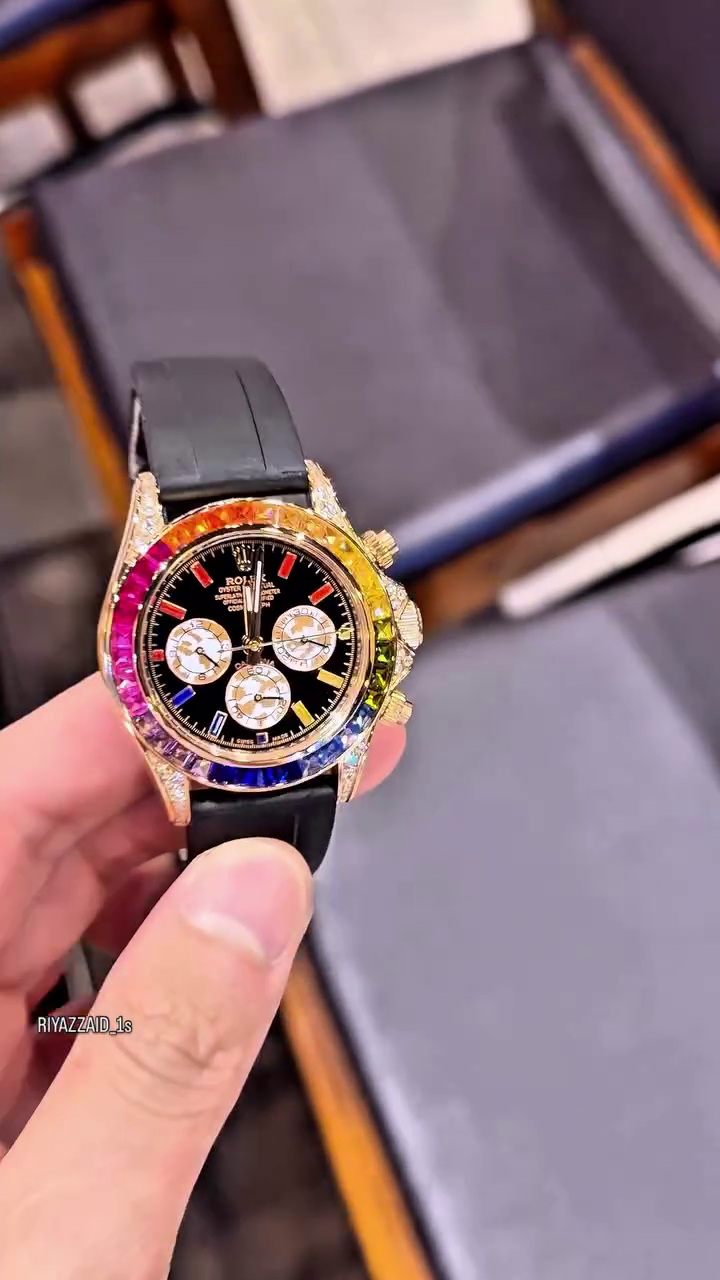 The standout feature of this watch is its rainbow-inspired bezel, meticulously set with vibrant, multicolored stones that transition smoothly around the dial. 💎🌈 This unique design adds a powerful visual impact, making the watch a true statement piece for both casual and high-end looks. The gemstone detailing extends to the lugs, enhancing its premium appeal and luxurious finish.