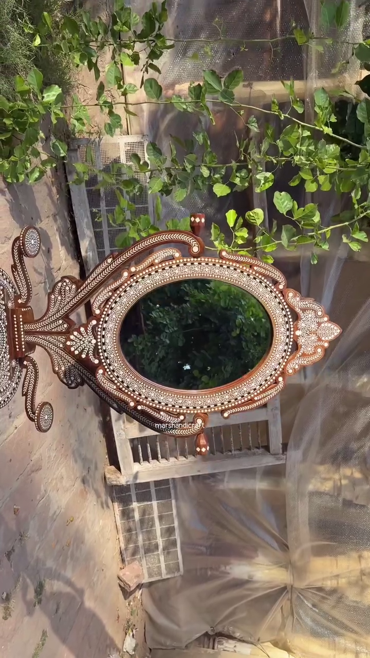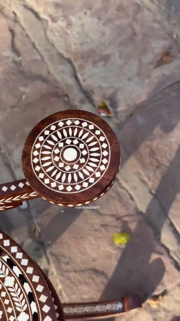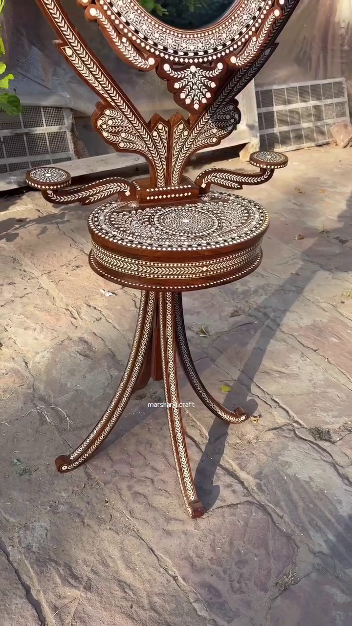 The frame features intricate bone inlay work set beautifully into rich polished wood, forming delicate floral and geometric patterns that reflect heritage luxury. Every detail—from the ornate crown to the gracefully curved stand—speaks of craftsmanship, patience, and cultural depth. 🤍🌸