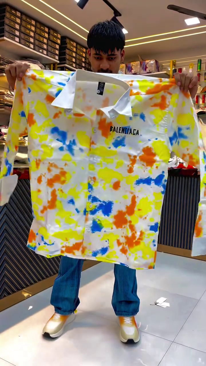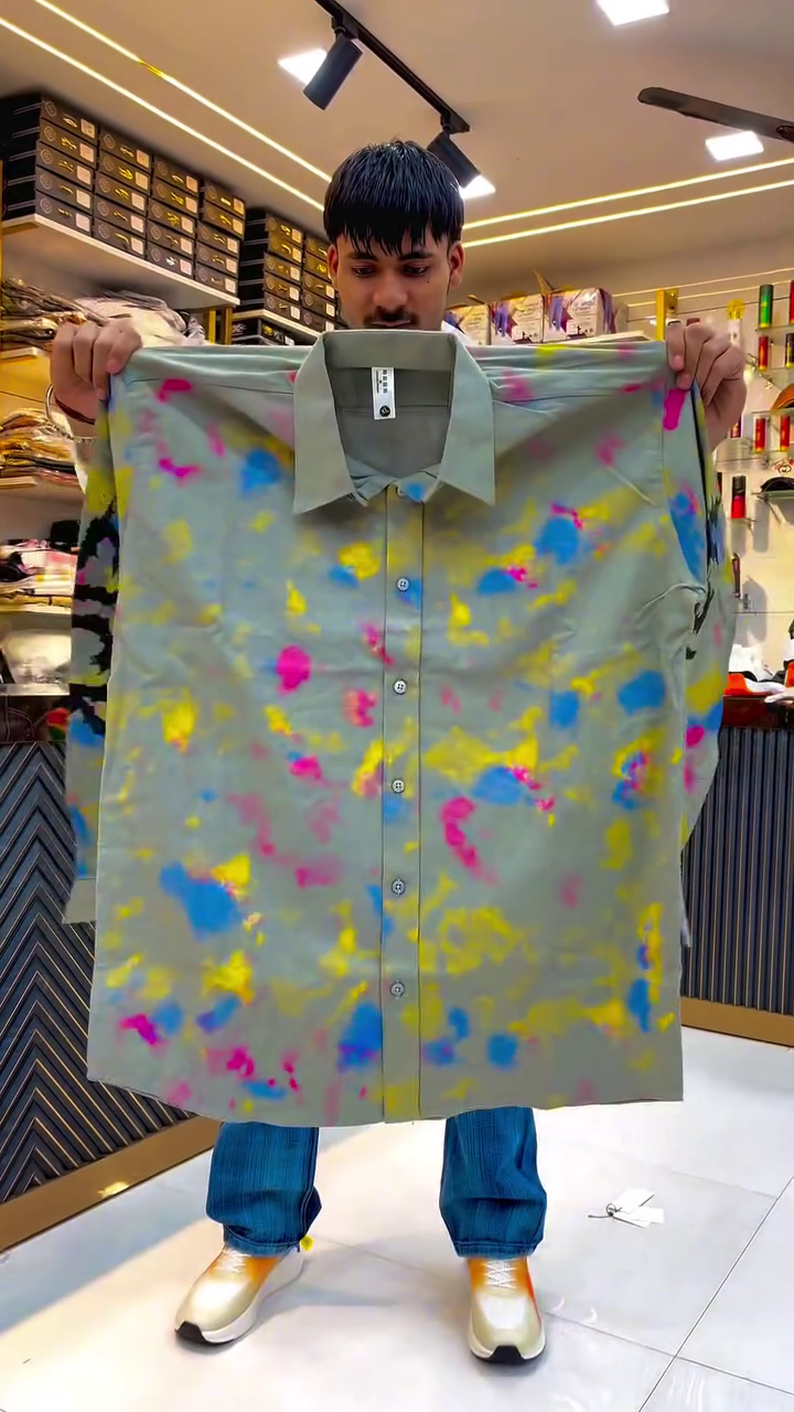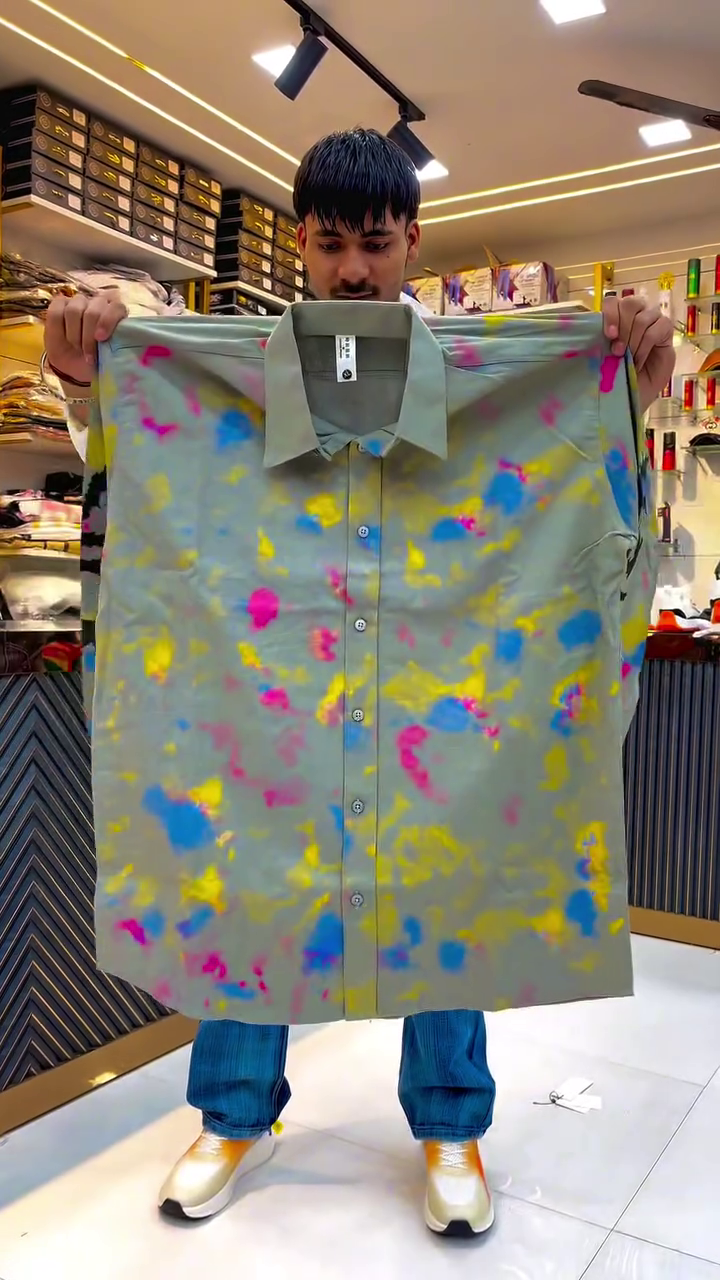 The highlight of this masterpiece is the multi-color splash print—a hand-painted inspired design featuring vibrant hues like yellow, blue, pink, and orange blended in an abstract artistic pattern. Each splash looks unique, giving every piece its own personality. This shirt celebrates creativity, energy, and confidence, creating a powerful fashion statement from every angle.