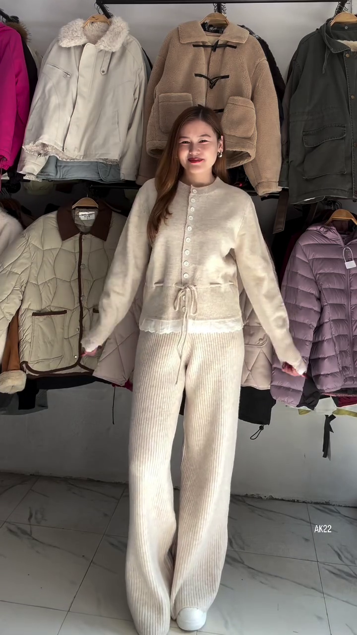 Paired with wide-leg ribbed knit pants, this co-ord set offers unrestricted movement and a relaxed fit that’s perfect for all-day wear. The elasticated waistband ensures comfort, while the flowing structure gives a chic, elongated look—ideal for pairing with sneakers, slippers, or ankle boots. 👟🥿