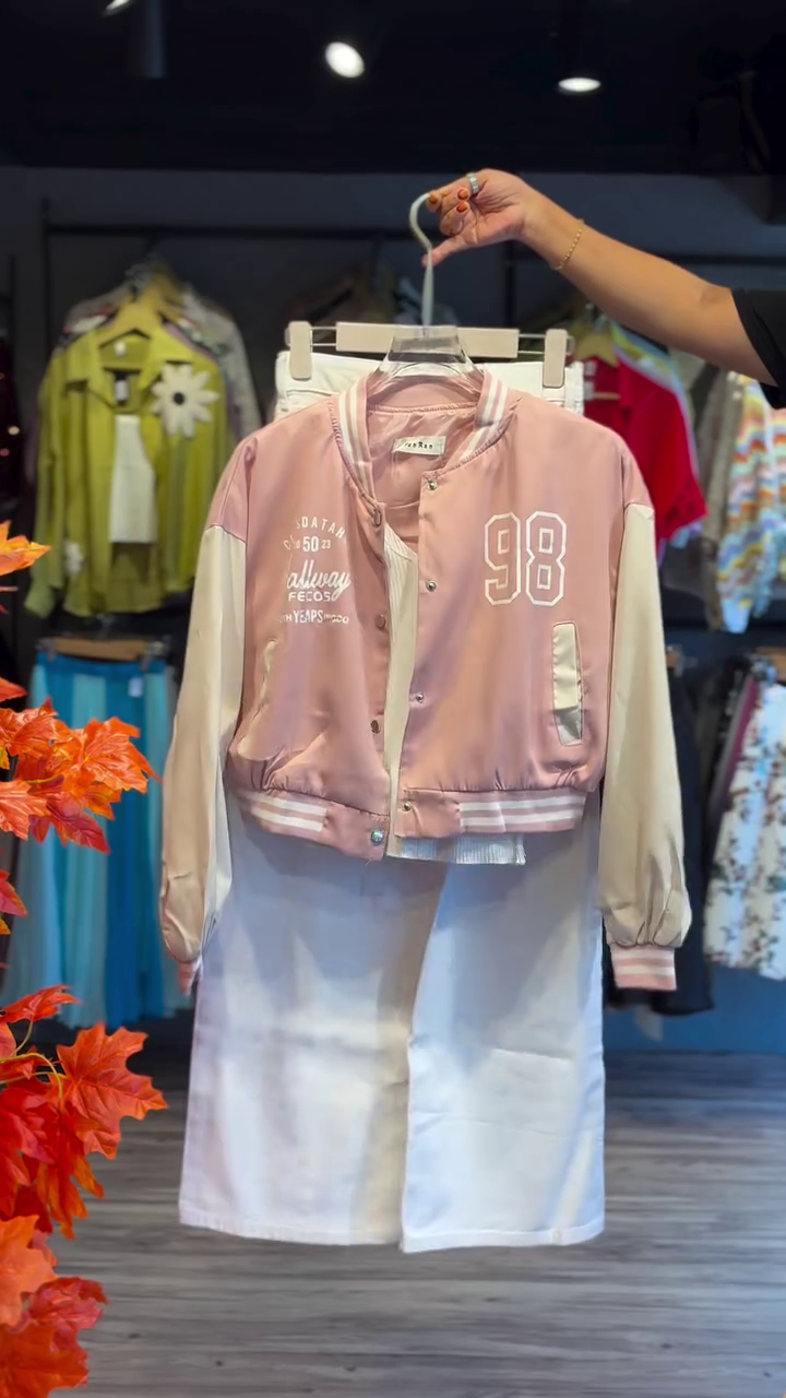 This trendy co-ord set includes a cropped varsity-style jacket and matching wide-leg pants, crafted to give you a flattering yet relaxed silhouette. The soft blush pink jacket features classic varsity detailing with contrast sleeves, snap-button closure, ribbed cuffs, and sporty typography accents that add a youthful, street-style vibe ๐งฅ๐ฅ. Paired with high-waist white wide-leg pants, the look feels clean, modern, and effortlessly chic.