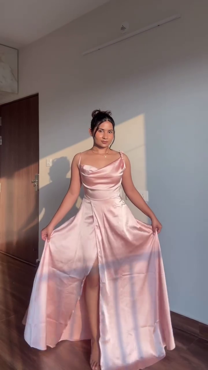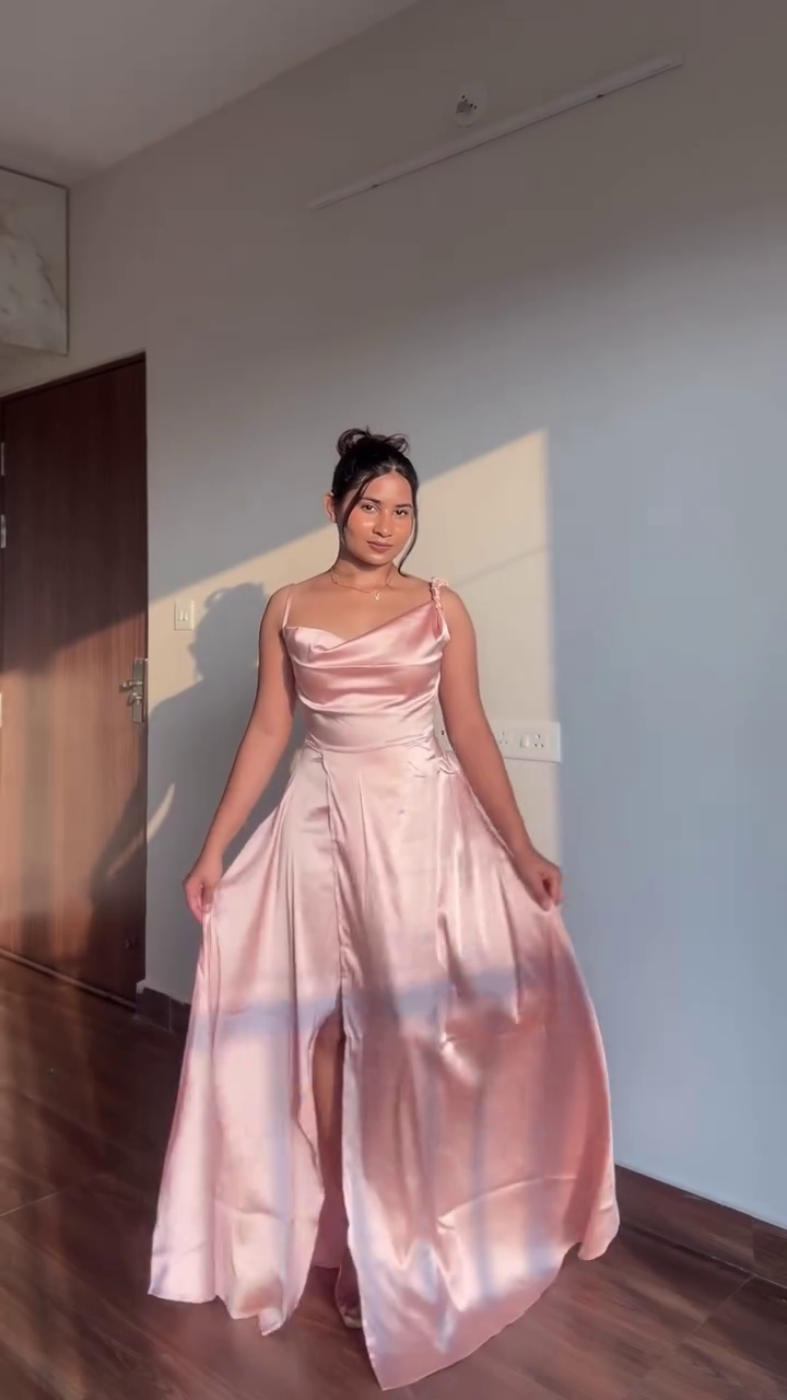 Soft rose-gold satin gown with a flowy high slit 🌸✨