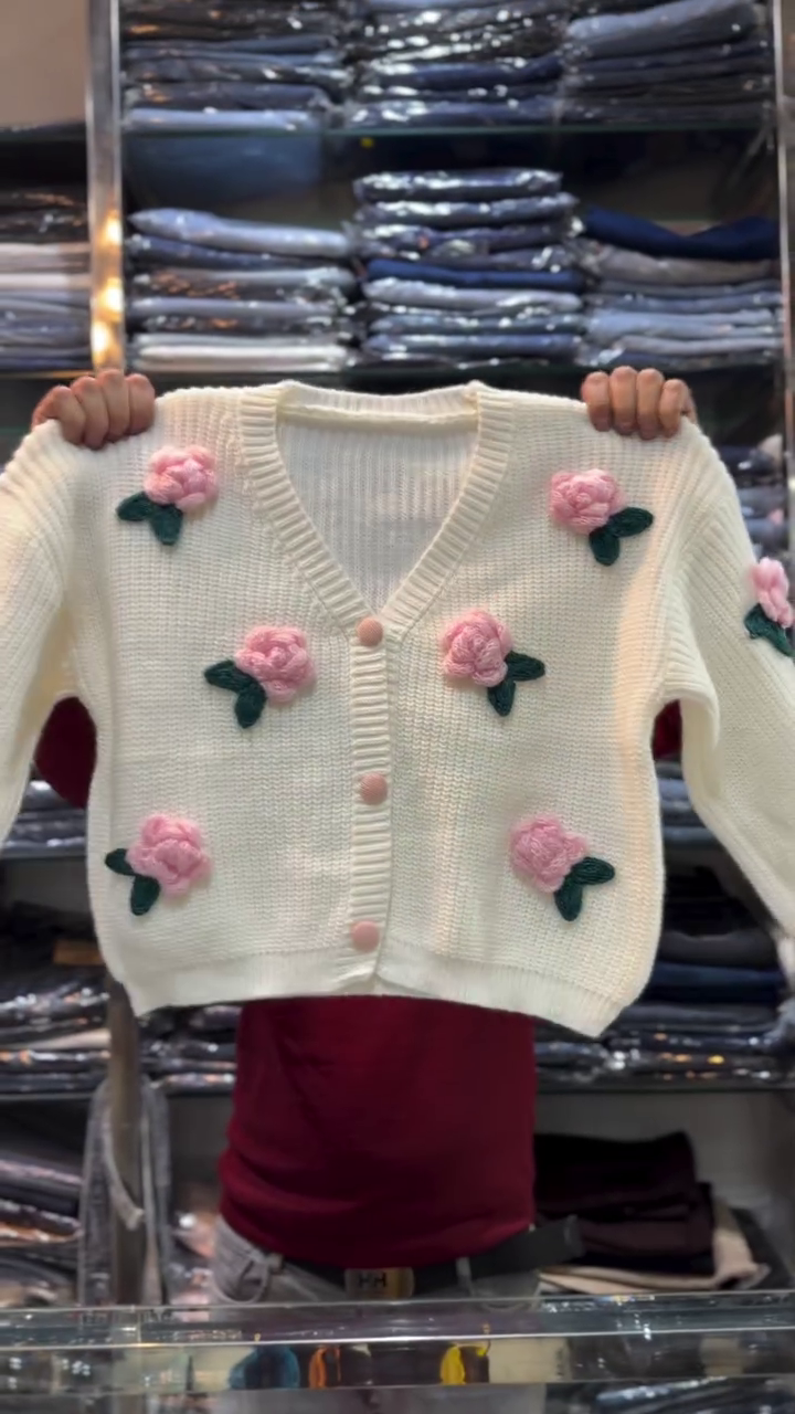The highlight of this cardigan is its beautiful 3D red rose floral appliquΓ© detailing πΉ. Carefully placed across the front and sleeves, the bold red flowers create a stunning contrast against the creamy ivory base, giving the cardigan a romantic and eye-catching appeal. Matching button-front closure adds a polished finish while keeping the design balanced and elegant.