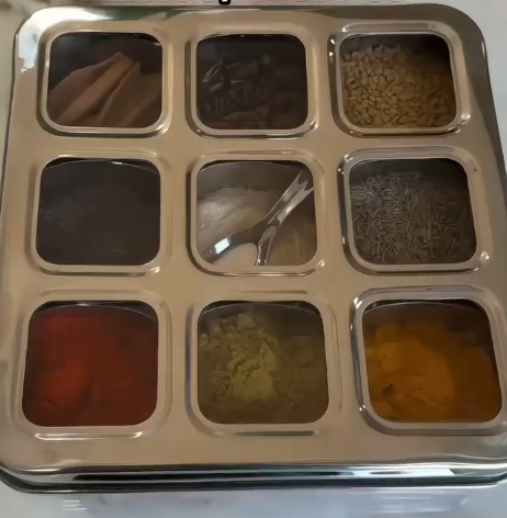 Featuring multiple individual compartments, this masala box allows you to store a variety of spices separately—keeping their aromas, flavors, and freshness intact. From turmeric, chili powder, cumin, and coriander to cardamom, cloves, and fennel seeds, each spice has its own dedicated space for easy access while cooking. The thoughtfully designed layout helps you cook faster and more efficiently. 🌶️🌾
