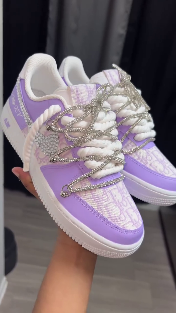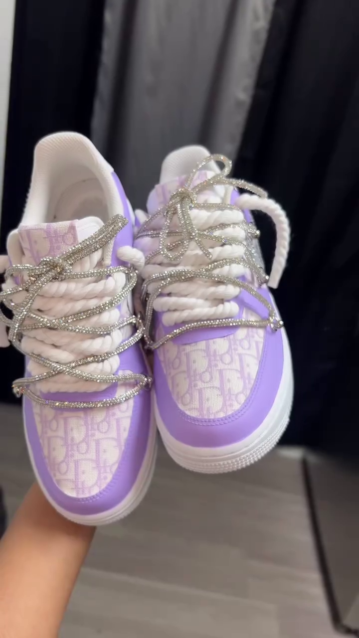 Crafted with premium-quality materials, these sneakers feature a beautifully detailed upper with a soft monogram-inspired pattern, finished with elegant lavender panels that add a fresh, stylish vibe. π The standout highlight is the sparkling crystal-style lace overlay, layered over thick rope laces, creating a bold yet feminine look that instantly catches the eye. β¨π