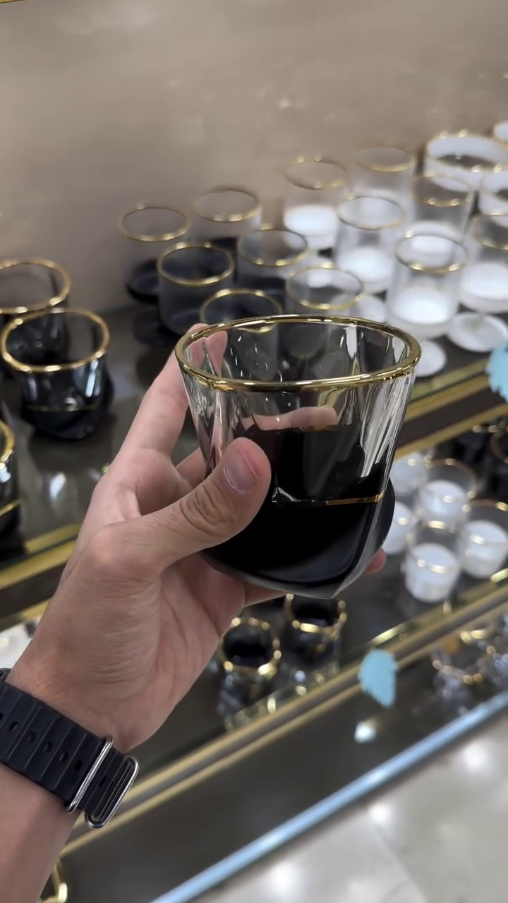 Designed with a striking two-tone finish, this glass features a deep matte black base paired with a crystal-clear upper body, separated by a sleek gold accent band πŸ€πŸ–€βœ¨ The polished gold rim adds a touch of glamour, creating a rich contrast that looks elegant, premium, and effortlessly stylish. Whether displayed in your cabinet or served at the table, these glasses make a bold statement.