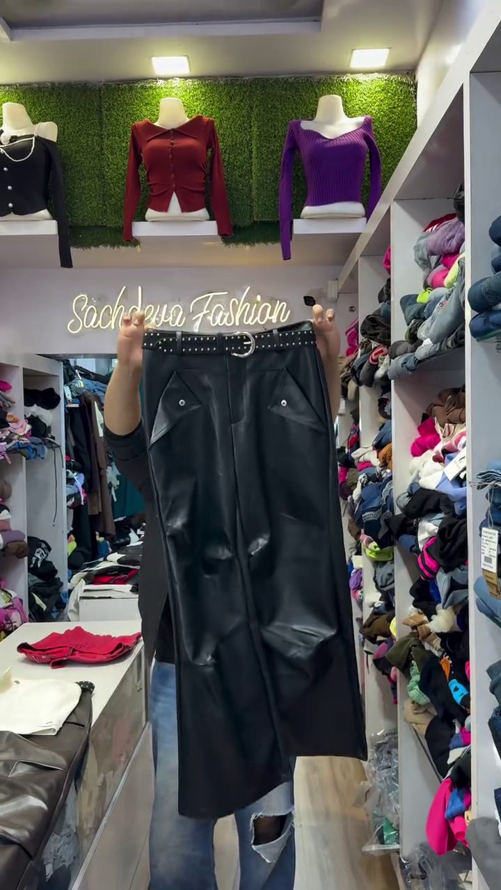 The cropped leather top features striking metal hook/eye detailing at the front, adding a bold statement vibe and adjustable fit ππ₯. Paired with a high-waist faux leather midi skirt, the look feels powerful and chic. The skirt is designed with utility-style pockets and a belt detail, giving it a modern, street-inspired edge while keeping it practical and stylish π.