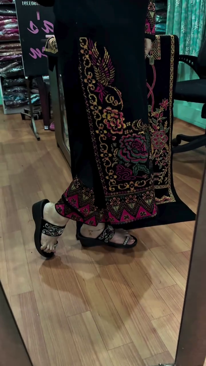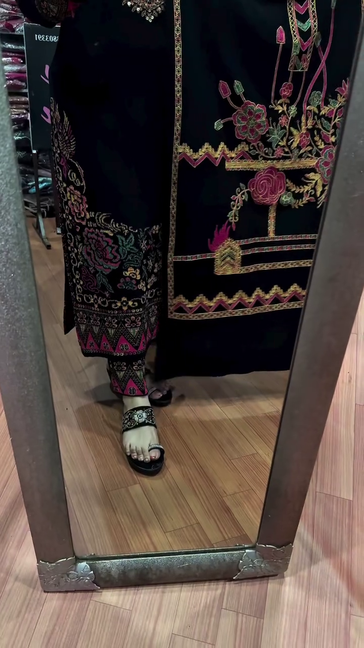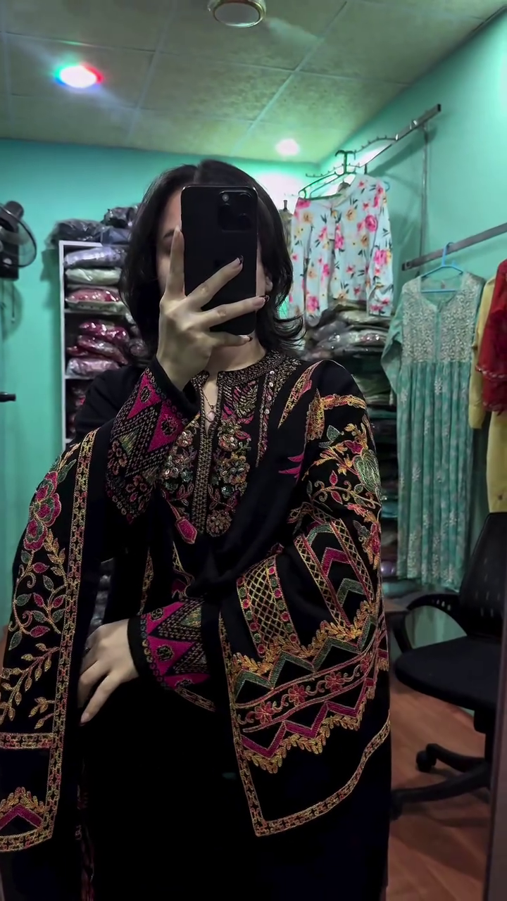The kurta features detailed Kashmiri-inspired embroidery in vibrant shades of pink, gold, green, and maroon, creating an eye-catching contrast that speaks of true craftsmanship. The sleeves are the highlight β adorned with heavy, ornate patterns that make a statement with every move. Paired with a matching embroidered bottom, this outfit is perfect for festive occasions, family functions, kitty parties, weddings, or elegant evening outings π«.