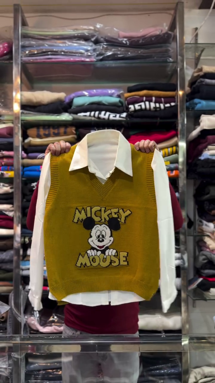 This stylish outfit features a soft knit sleeveless vest layered over a classic full-sleeve shirt, giving you a smart, ready-to-style look in one piece 🤍. The vest showcases an adorable Mickey Mouse knit design with bold lettering, adding a fun and youthful vibe that instantly stands out.