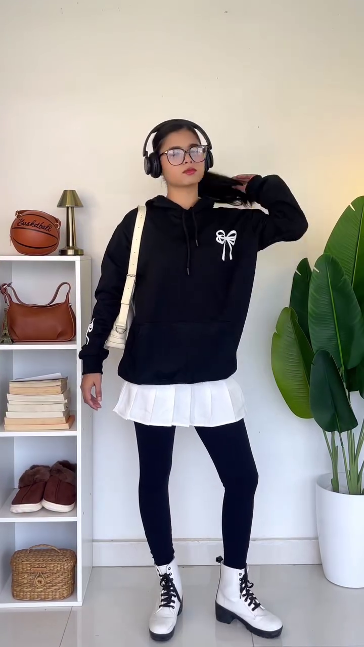 The second outfit embraces monochrome contrast through a black hoodie featuring a cute white bow print. Styled over a crisp white pleated mini skirt that peeks out beneath the hem, this look plays with layering to create depth and visual interest. Adding black leggings makes the outfit practical for cooler days while keeping the streamlined silhouette intact. The striking white lace-up combat boots bring edge and structure, creating a perfect balance between soft and bold elements. The cream shoulder bag complements the white details beautifully, tying the outfit together through coordinated accents. Large glasses and headphones add a modern, casual-tech vibe, suggesting a look ideal for studying, traveling, or simply enjoying music outdoors.
