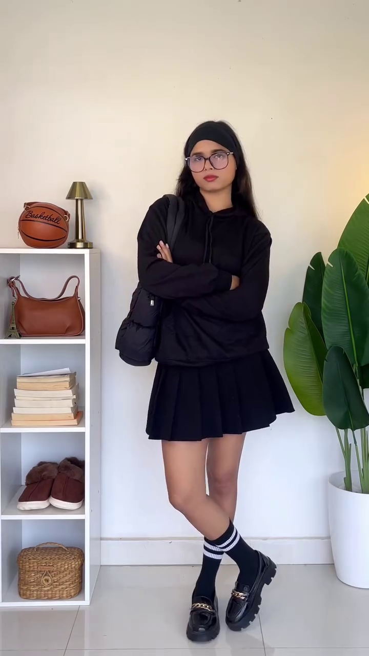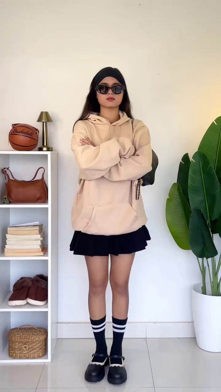 The first outfit features a soft beige oversized hoodie paired with a classic black pleated skirt. This combination creates the perfect contrast—light and neutral on top, dark and structured on the bottom—giving the outfit a balanced and flattering silhouette. The pleated skirt adds movement and a hint of preppy charm, making the oversized top look intentional and stylish rather than slouchy. The black knee-high socks, detailed with white stripes, enhance the sporty-cute aesthetic and visually elongate the legs. Paired with chunky Mary Jane-style shoes, the look becomes a blend of school-girl vibes and contemporary street style. The black headband and mini black handbag complete the outfit with coordinated accessories that pull the entire look together, adding coherence without overwhelming the simplicity of the hoodie.