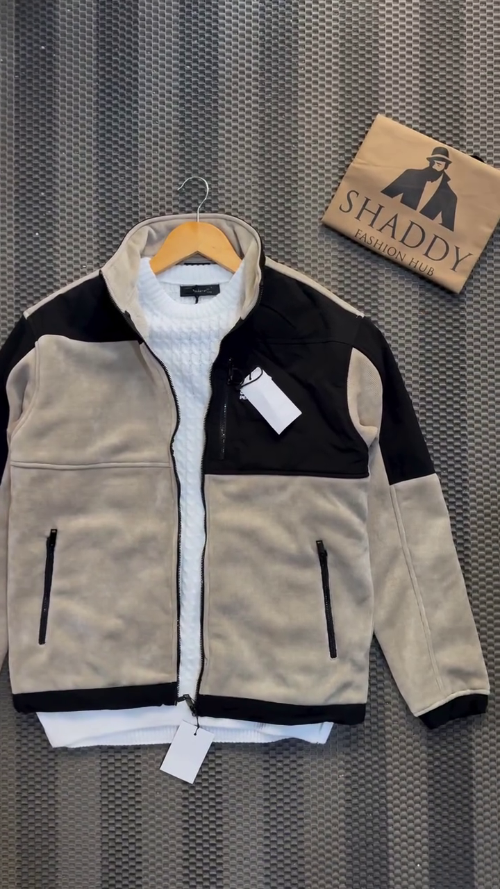The jacket is made from high-quality fleece-blend material, offering superior insulation without feeling heavy. The inner side feels soft and cozy on the skin, making it ideal for long hours of wear during chilly mornings and breezy evenings ❄. It features a smooth front zipper, secure zipper pockets, and a stylish stand collar that adds a sporty, premium touch. The contrasting panels give a sharp, masculine edge, making the outfit look expensive and well-tailored.