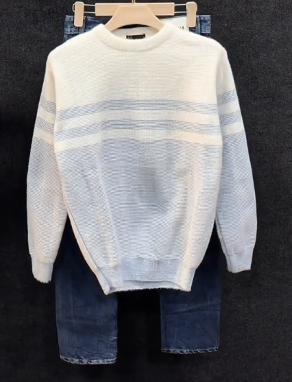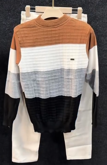 The sweatshirt features a beautiful color-block pattern with earthy and neutral tones that create a sophisticated, premium feel. The subtle ribbed texture adds depth and elegance, giving the outfit a refined finish rather than a basic look β¨. The round neckline and full sleeves make it ideal for everyday wear while maintaining a smart silhouette. A minimal logo detail on the chest adds a touch of understated branding for a polished appearance.