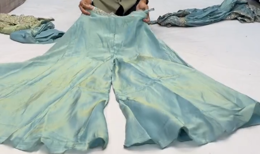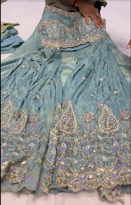 This exquisite set features a beautifully flared sharara bottom crafted from premium flowy fabric that moves effortlessly with every step. The sharara is adorned with intricate zari, sequin, and thread embroidery, highlighted with elegant paisley and floral motifs ๐ธ. The soft sea-green/blue tone adds a refreshing, regal charm that flatters all skin tones.